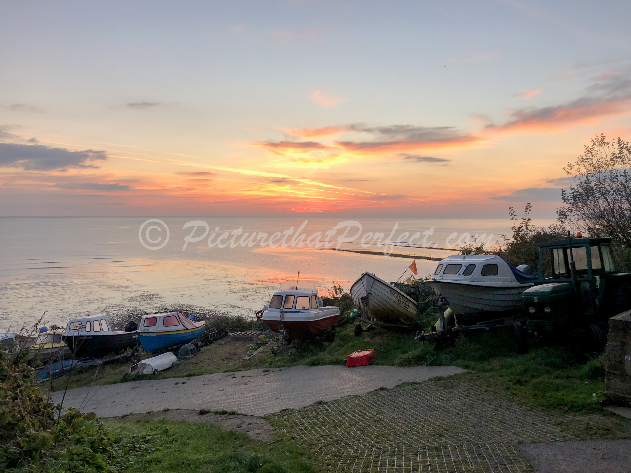 An Auntumn sunrise with boats viewed from the sea wall in Robinhoods Bay, North Yorkshire.