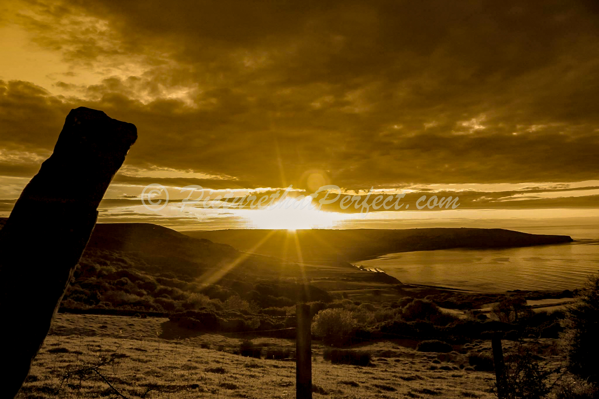 A hazey orange sunset scene from Ravenscar, North Yorkshire.