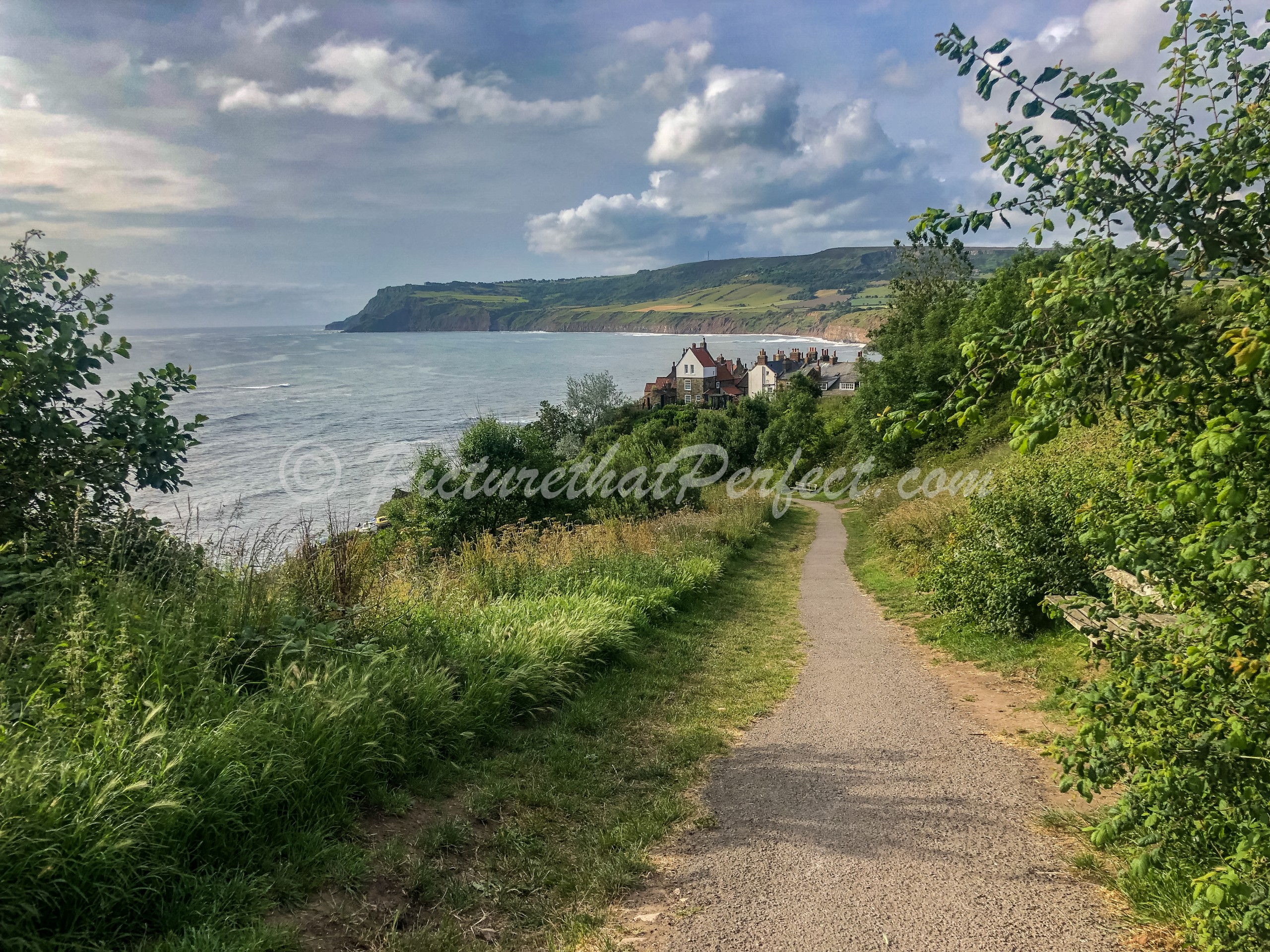 A scene of Robinhoods bay viewed from the track above the sea wall